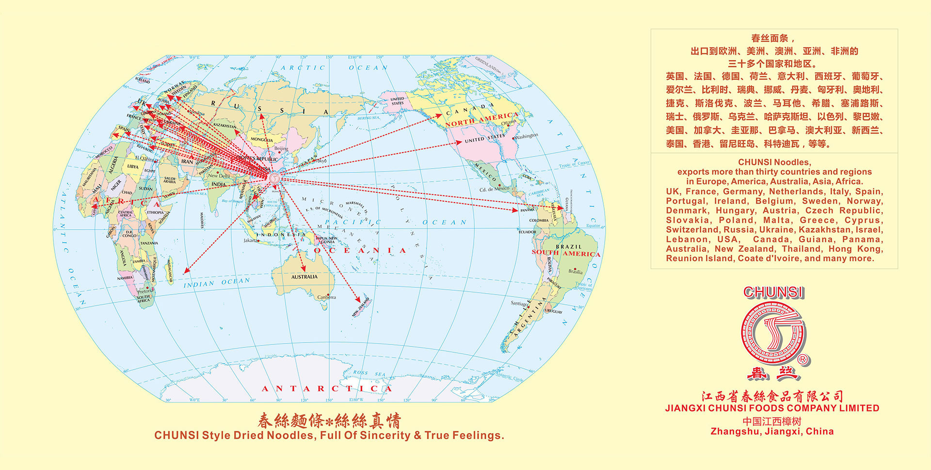 江西省春絲食品有限公司位于江西省樟樹市。 樟樹具有制作面條的悠久歷史傳統(tǒng)。古來即有民謠:“臨江府、清江縣(即樟樹),六歲伢仔會做面。” 今春絲公司是江西省內(nèi)具有規(guī)模的面條、米粉加工企業(yè),也是全國知名的面條生產(chǎn)企業(yè)。春絲公司現(xiàn)擁有“春絲”、“凌波仙子”、“絲絲福”、“春佳”四大品牌,一百多個品種。所有面條、米粉產(chǎn)品均選用合格原料,符合國家質(zhì)量和衛(wèi)生標(biāo)準(zhǔn)。產(chǎn)品具有安全健康、面體勁道、柔韌爽滑、易熟、久煮不糊、不渾湯等特色,深受廣大消費(fèi)者歡迎。春絲產(chǎn)品已全面進(jìn)入沃爾瑪、家樂福、樂購、歐尚、好又多、易初蓮花等大型超市,并遠(yuǎn)銷美國、日本、英國、德國、法國、西班牙、意大利、葡萄牙、香港等二十多個國家和地區(qū)。